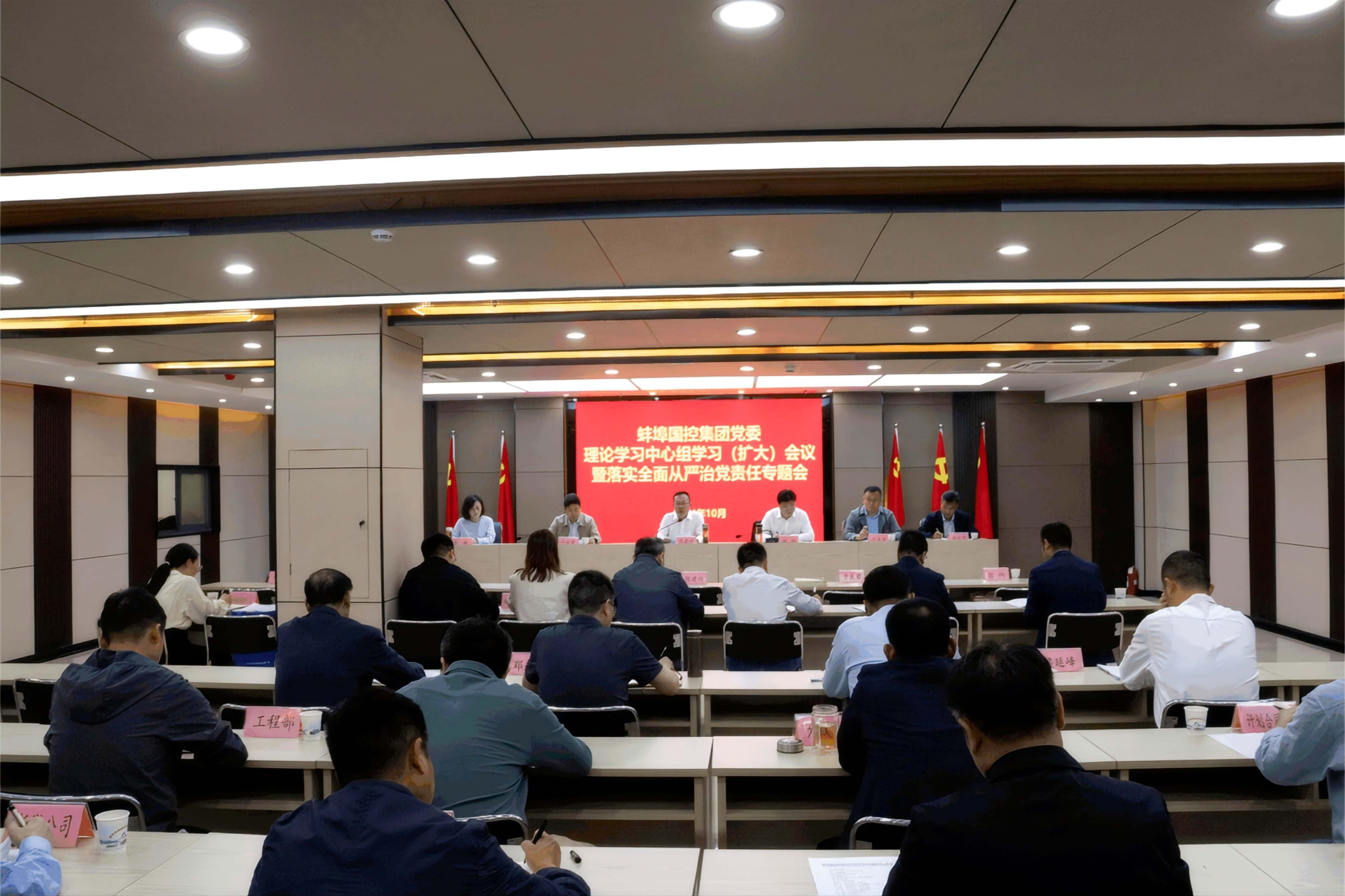 10月16日下午,市國控集團黨委召開理論學習中心組學習(擴大)會議暨落實全面從嚴治黨責任專題會。集團黨委書記、董事長陳建功主持會議并講話。集團領導班子成員、各部門負責人,水投集團領導班子成員、各部門負責人及子公司負責人參加會議。