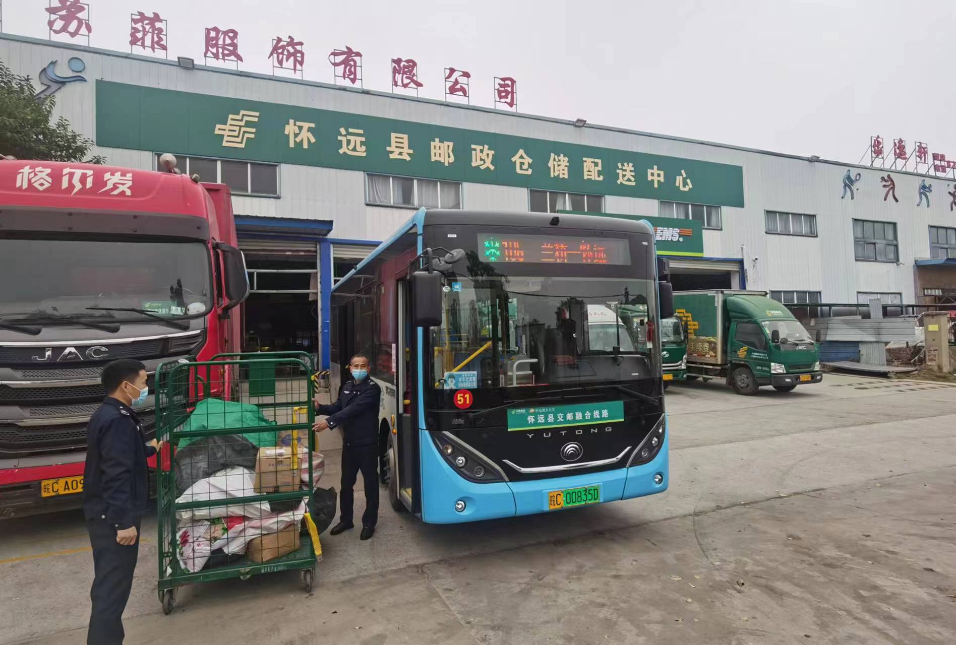 懷遠城鄉公交“交郵融合”項目,即利用四通八達城鄉公交網絡,在客流低谷時段利用車輛富余裝載空間,將郵政快遞交由城鄉公交車輛代運代投。該項目有效降低了郵政企業人員和運輸成本,增加了農村客運車輛效益,彌補了鄉村物流短板,同時實現農村客運穩健發展,是“一點多能、一網多用、功能集約、便利高效”的農村運輸服務發展新模式。目前,懷遠城鄉公交公司與中國郵政集團懷遠分公司合作,已開通“交郵融合”線路3條,建立蘭橋、龍亢農場寄遞共配中心2座,承攬了蘭橋、魏莊、徐圩、龍亢等4個鄉鎮以及農墾集團龍亢農場場區的郵政快遞運輸業務,日均運輸快遞約2600件,每年通過公交車輛代運快遞95萬件。