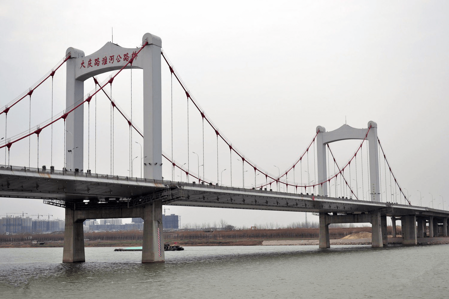 蚌埠市大慶路淮河公路橋于2009年12月開建,工期為3年,是蚌埠第三座淮河大橋,工程投資總概算達6.87億元。全線將設互通立交一處,采用雙向六車道設計,并設置非機動車道和人行道,設計速度60公里/小時。主橋采用雙塔雙索面自錨式懸鎖結構,路橋全長2.38公里,其中主橋長1778米,兩端接線602米,南岸設有四層八向互通立交,是淮河上第一座自錨式懸鎖橋。