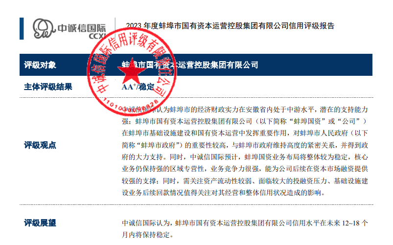 2023年9月4日,經中誠信國際信用評級有限公司評定,蚌埠市國有資本運營控股集團有限公司再次成功獲評AA+主體信用評級,評級展望為穩定,時效期為一年。這是蚌埠國控集團繼2022年8月5日獲得東方金誠國際信用評估有限公司評定的AA+主體信用評級后,再次評為AA+級信用主體,實現了AA+主體信用“雙評級”。